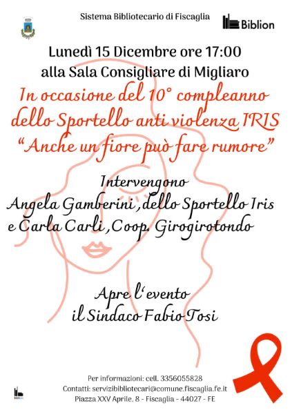 In occasione del 10° Compleanno dello sportello antiviolenza "IRIS". Lunedì 15 Dicembre 2025, ore 17:00, presso la Sala Consiliare della Loc. Migliaro.